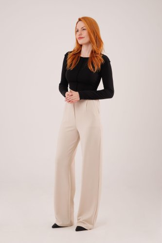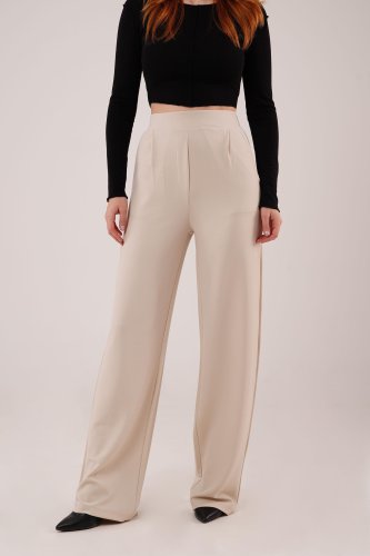Yüksek Bel Bol Paça Krep Krem Pantolon