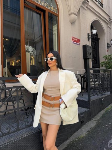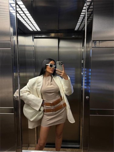 POLYVİSCON ÇİFT KEMER DETAYLI ELBİSE Bej
